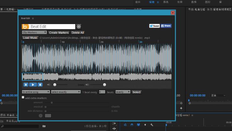 第一步,添加鼓点很明显的音频到鼓点插件生成关键帧标记时间线。点击load Music上传音频,上传等待加载解析音乐,完成后可以播放鼓点效果并调整鼓点节拍。点击Create Mrakers即可。